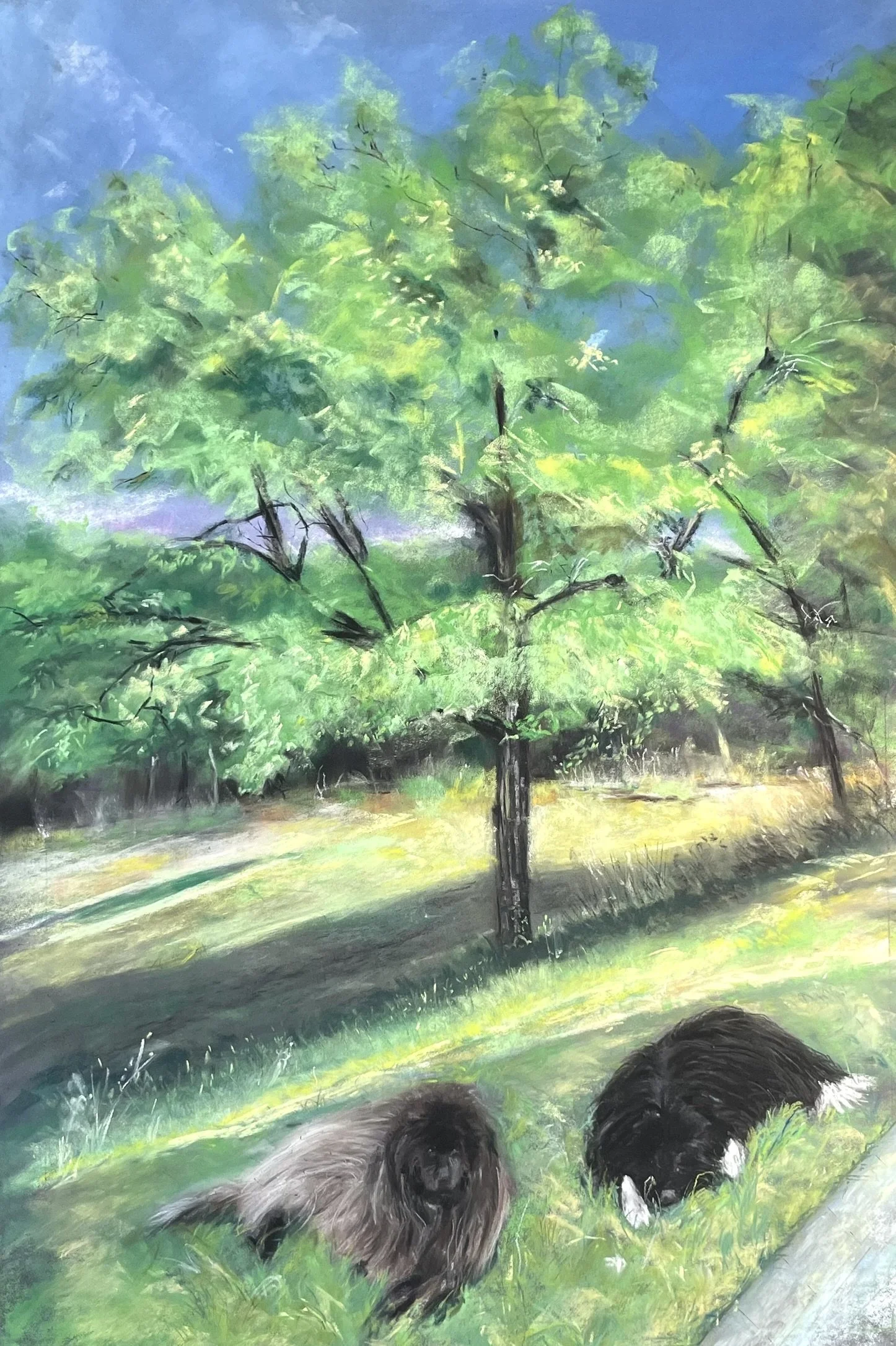 « Ce tableau est une ode à la résilience et à l’amour. Il m’a été commandé par une personne qui m’a confié, comme un murmure, une histoire intime : celle de ce noyer majestueux, sauvé à plusieurs reprises, trônant au cœur d’un lieu chargé de souvenirs. Sous son feuillage, deux chiens paisibles incarnent la tendresse et la fidélité. Chaque détail a été pensé selon la note d’intention transmise par la personne qui m’a confié ce paysage unique, gravé dans son cœur. »